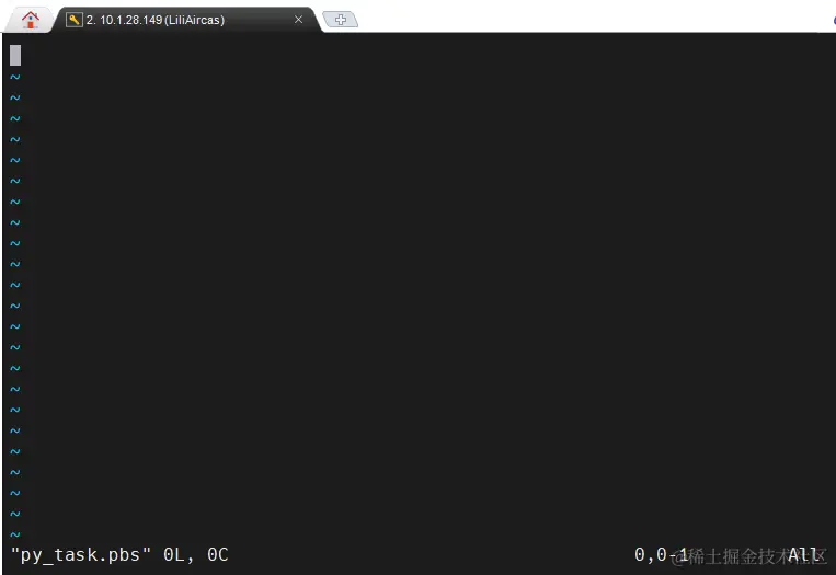 其中,Vim是一个强大的文本编辑器,广泛用于命令行环境下代码的编写和文本的编辑。执行上述代码,如下图所示。可以看到,py_task.pbs这个PBS脚本文件已经被Vim打开了。