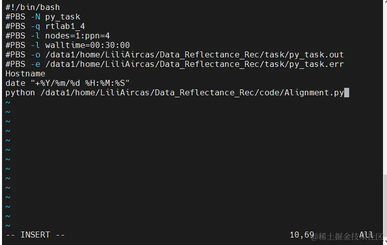 随后,即可在Vim中编辑PBS脚本文件。在这里,我们给出2个PBS脚本文件的模板;其中,第1个模板如下所示。