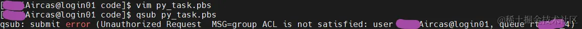 当然,有的时候执行上述代码,会出现如下图所示的错误,即qsub: submit error (Unauthorized Request...)字样的报错。