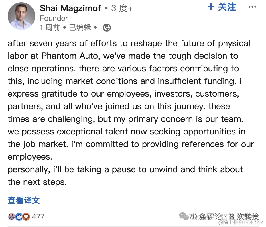 最新消息,专做云代驾的自动驾驶初创公司 Phantom Auto,官宣停止运营。