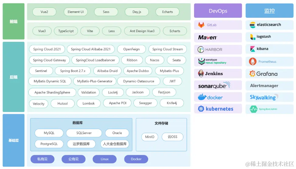 采用前后端分离技术,后端采用java主流开发技术栈,前端同时适配Vue2/Vue3技术栈;