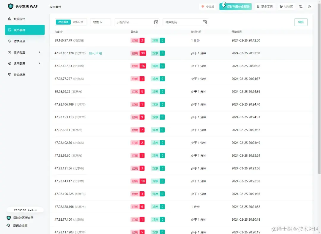 SafeLine 已经被安装超过 6w 次,保护的网站超过 50w 个,每天处理 HTTP 请求超过 200亿 次,每天拦截攻击超过 1亿次。核心功能攻击事件统计