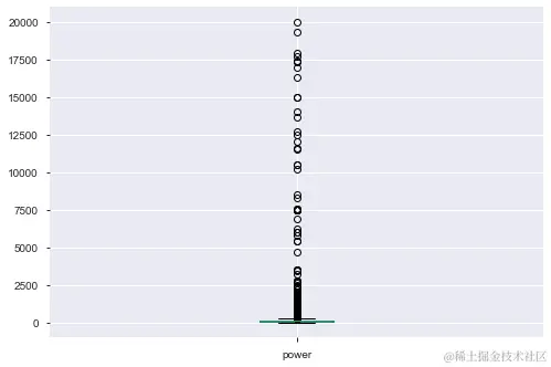 接下来,介绍一下箱线图筛选异常并进行截尾。从上面的探索中发现,某些数值型字段有异常点,可以看一下power这个字段: