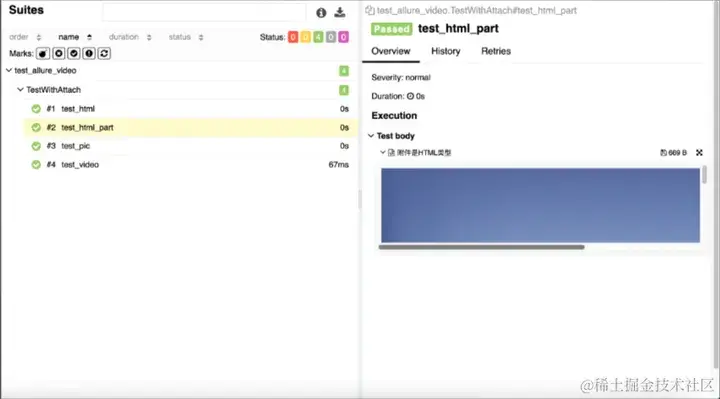 - 应用场景:可以定制测试报告页面效果,可以将 HTML 类型的附件显示在报告页面上。