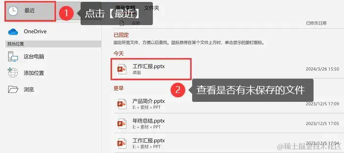 步骤3:在新窗口中,选择 【最近】或【恢复未保存的文档】选项。PowerPoint会列出最近打开或未保存的文档;