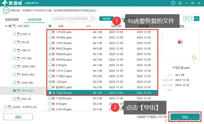 步骤3:勾选完所有需要恢复的文件之后,确认选择的文件是正确的,并点击【导出】,选择与文件原保存位置不同的位置保存导出后的文件。
