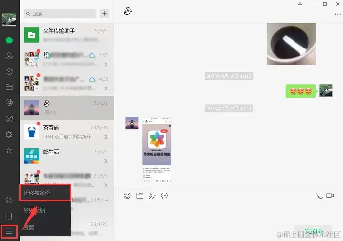 步骤1:在电脑打开微信应用,点击**【三横杆】图标,再点击并进入【迁移与备份】**界面。