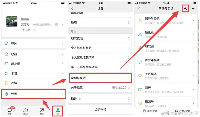 步骤1:依次点击**【我】-【设置】-【帮助与反馈】,找到并点击【扳手图标】**。