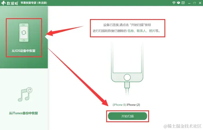 步骤2:一般情况下,我们默认选择**【从iOS设备中恢复】模式,点击【开始扫描】**按钮。