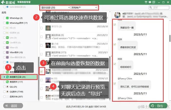 步骤3:在扫描结果界面左侧点击**【微信聊天记录】,通过【筛选器】快速查找需要恢复的聊天记录。在界面右侧对数据进行预览,无误后勾选要恢复的聊天记录,点击【导出】**按钮即可。