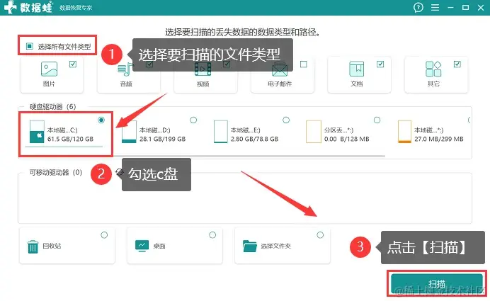 第1步:在电脑上双击运行软件,打开后,先勾选上要恢复的c盘文件类型,并勾选上【c盘】,单击【扫描】;