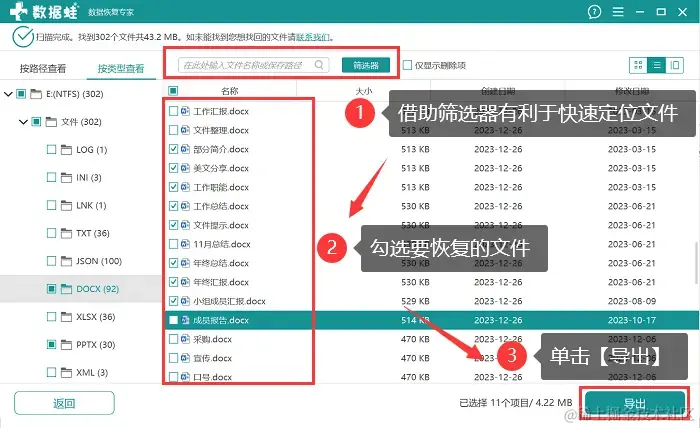 第2步:在扫描完成后,选择要恢复的文件类型并在右侧进行查看,可以直接勾选上所要恢复的文件,点击【导出】;