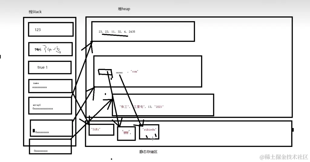 比如对于字符串数组,arrays变量就是在栈的地址,引用了在堆存储的字符串数组的地址,堆的字符串数组 地址又引用了静态存储区的字符串,所以本质上字符串还是存储在静态存储区