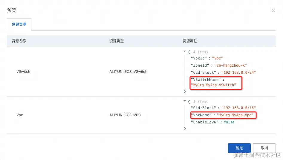 预览资源栈,可以看到Vpc和VSwitch名称属性的前缀都为NamePrefix中设定的值。