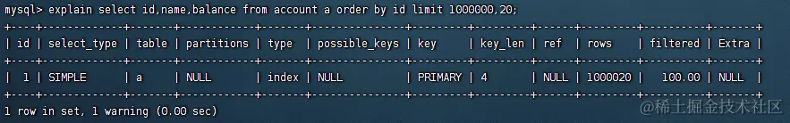 select id,name,balance from account a limit 1000000,20;