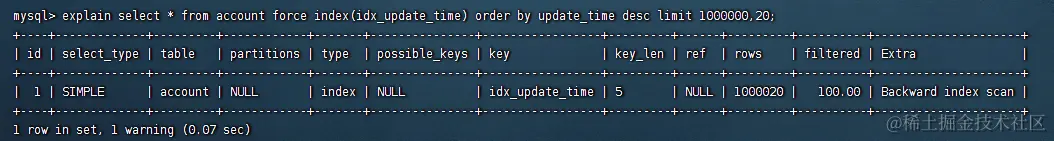 select * from account force index(idx_update_time) order by update_time desc limit 1000000,20;