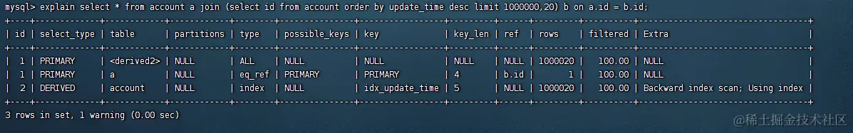 select * from account a join (select id from account order by update_time desc limit 1000000,20) b on a.id = b.id;