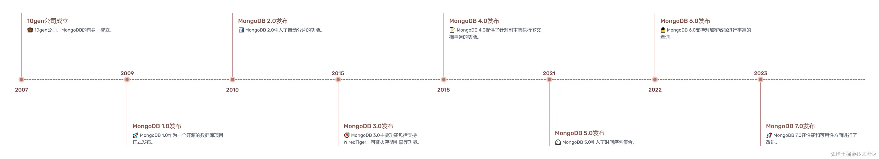 - 2010年,MongoDB 2.0发布,引入了自动分片的功能,实现了水平扩展和高可用性。