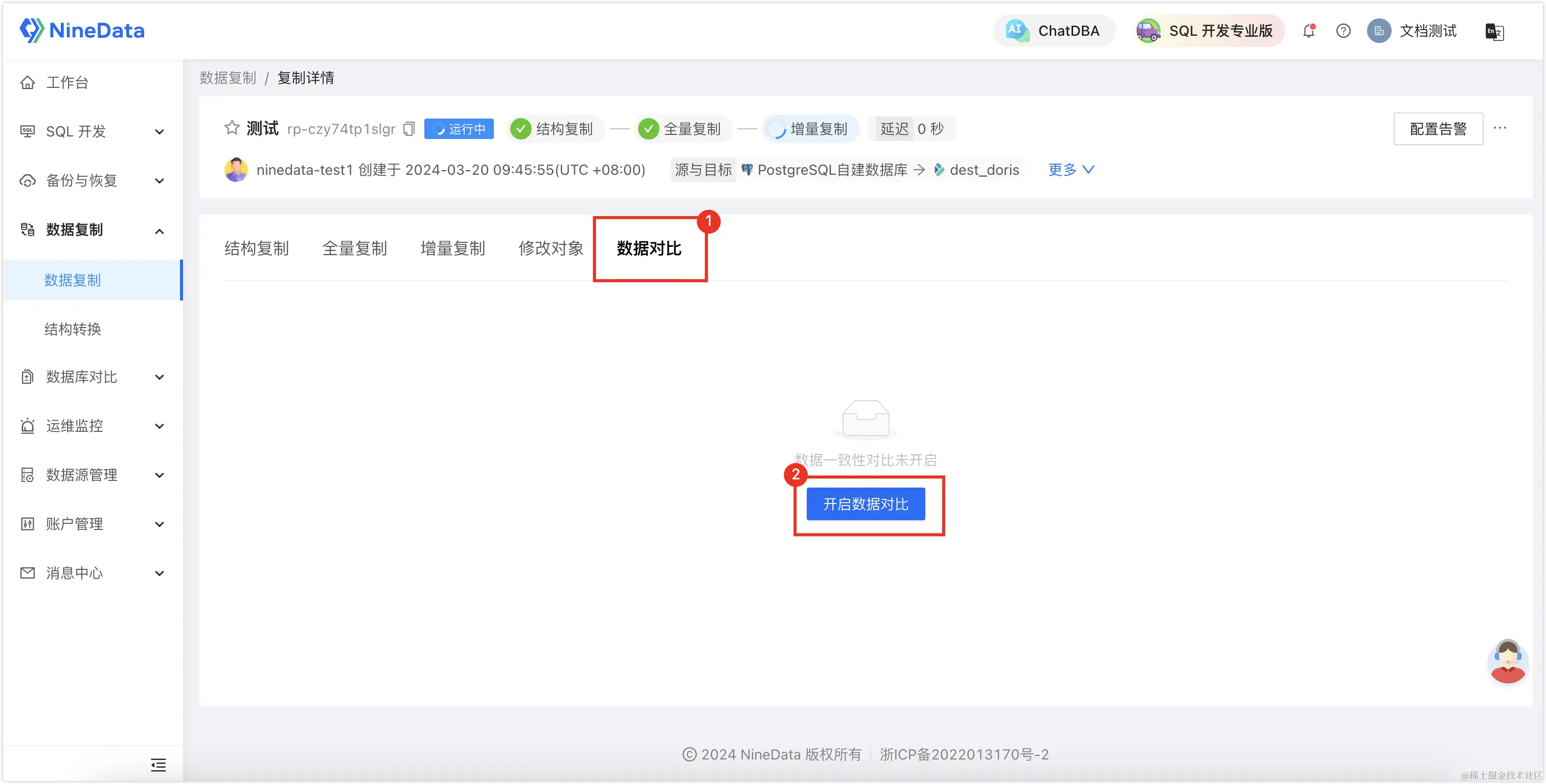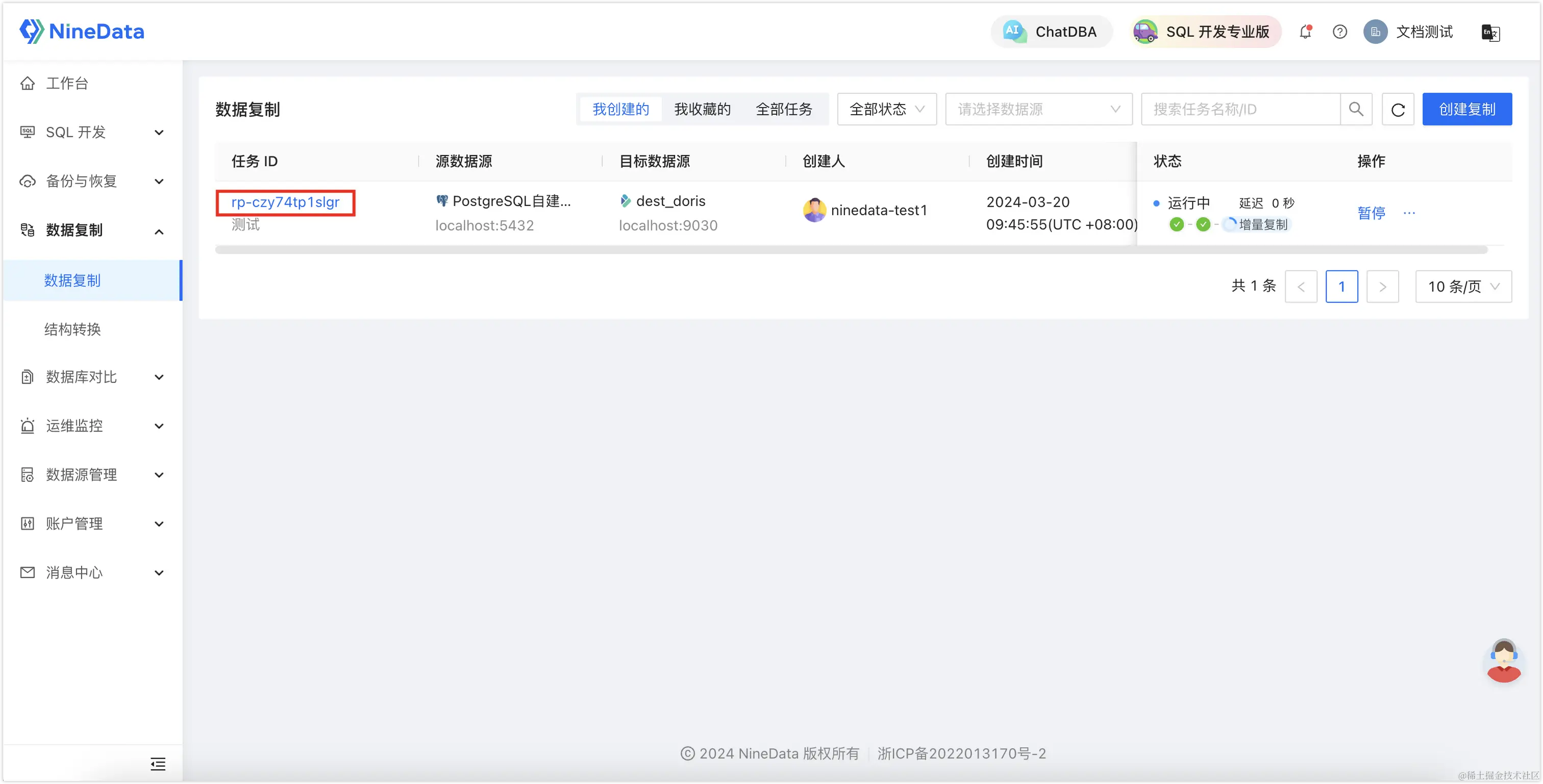 登录NineData控制台,单击数据复制>数据复制,然后单击步骤二中创建的复制任务 ID。