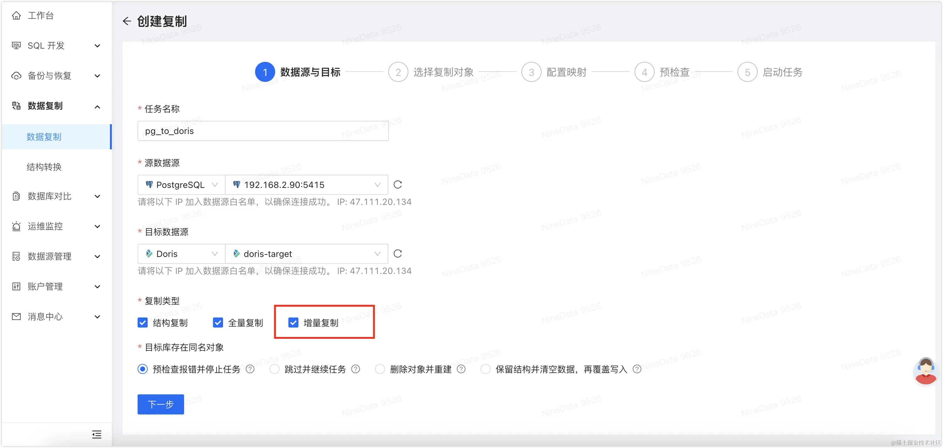 根据页面提示配置复制任务,由于我们想要实现长期的实时数据同步,需要在复制类型处额外勾选增量复制。