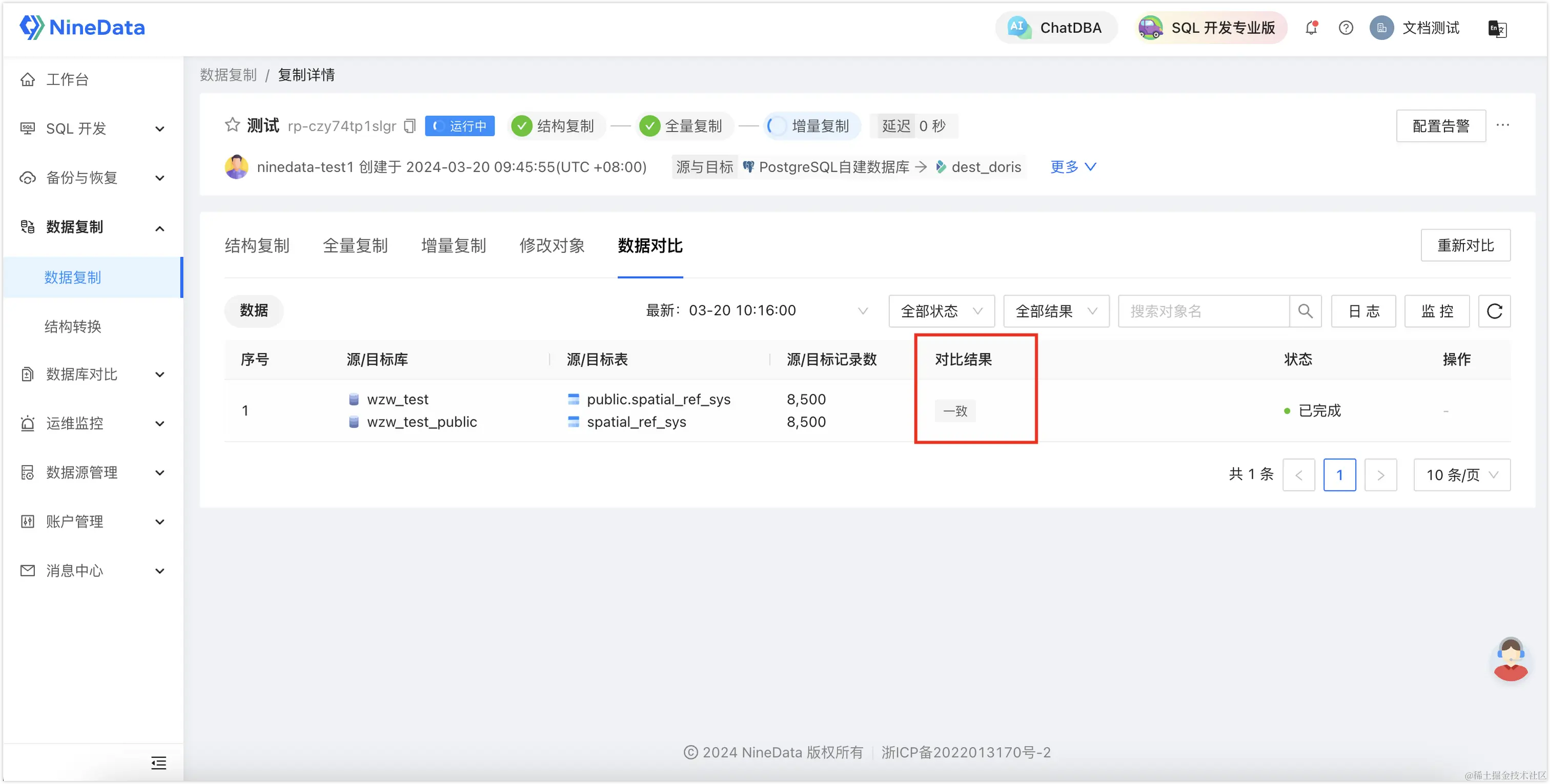 除了同步功能以外,NineData 还提供了同步后源端和目标端同步数据的对比功能,以确保目标端数据的完整性。