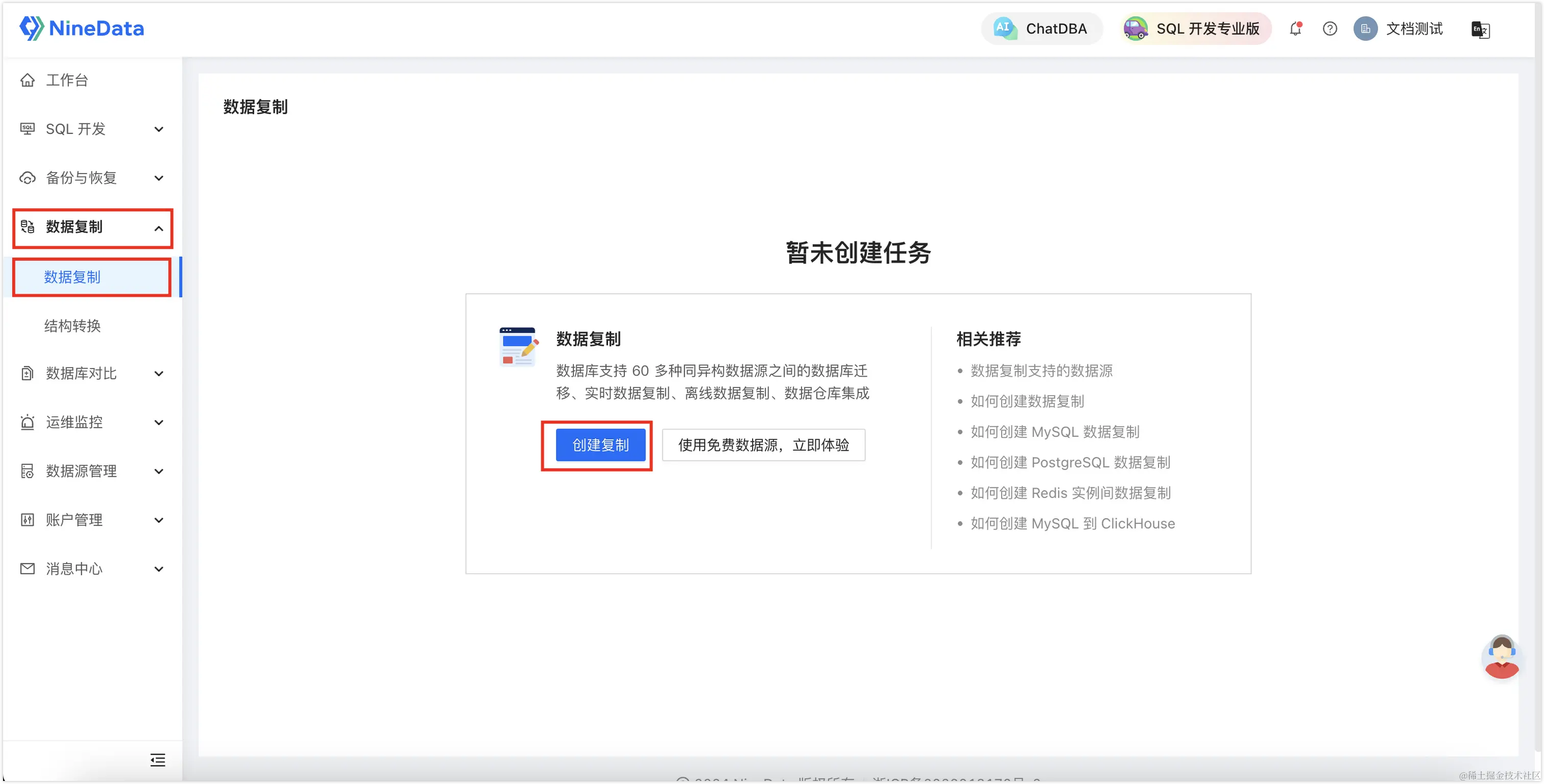 登录NineData控制台,单击数据复制>数据复制,然后单击创建复制。
