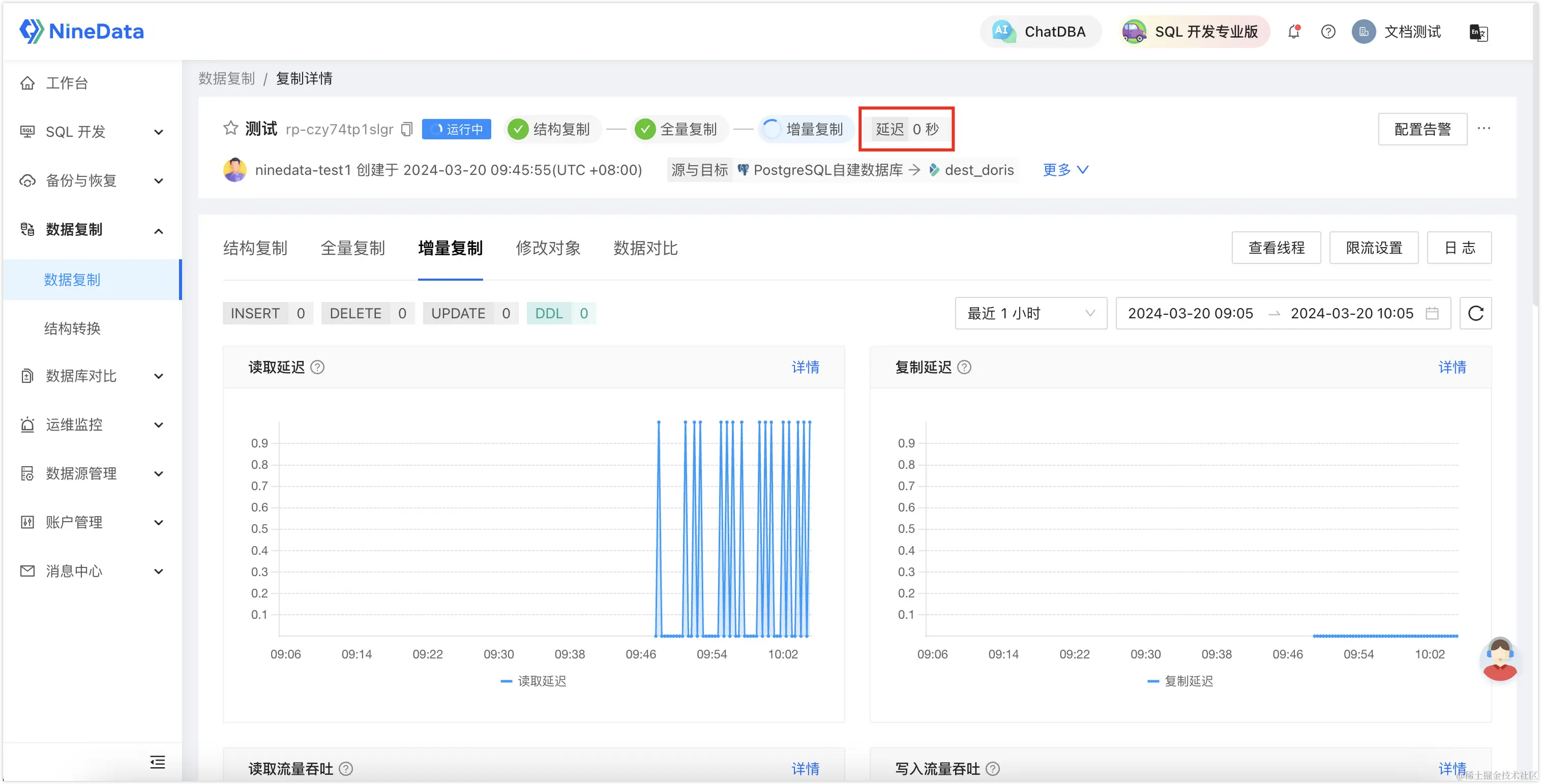 配置完成后启动任务,针对您配置的所有同步对象,NineData会先对所有的存量数据进行全量迁移,接下来就是实时同步PostgreSQL中新增的增量数据,所有新写入的数据都将一条不漏地同步到Doris,每当目标端的增量数据追平源端时,任务面板中会显示延迟 0 秒,如下图所示。