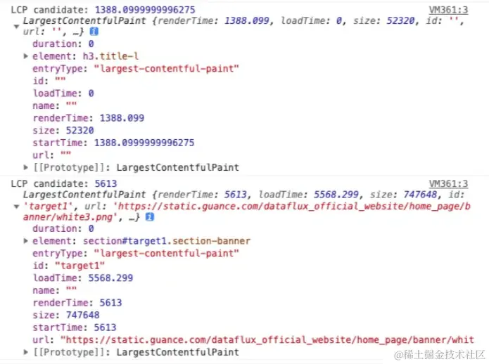 执行的结果是,如果检测到 LCP ,会打印 LCP 相关信息,见下图: