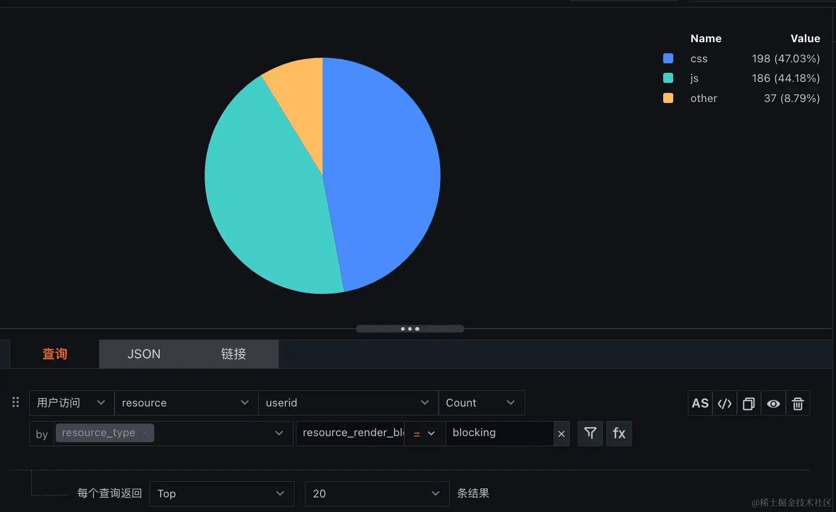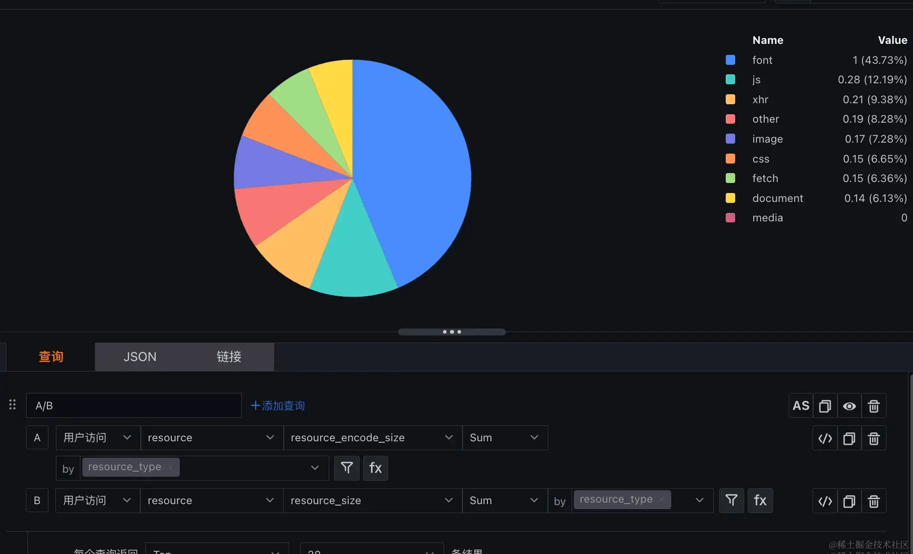 上图中,我们能看到 js css 等阻塞了页面渲染。我们按资源类型,查看一下占比: