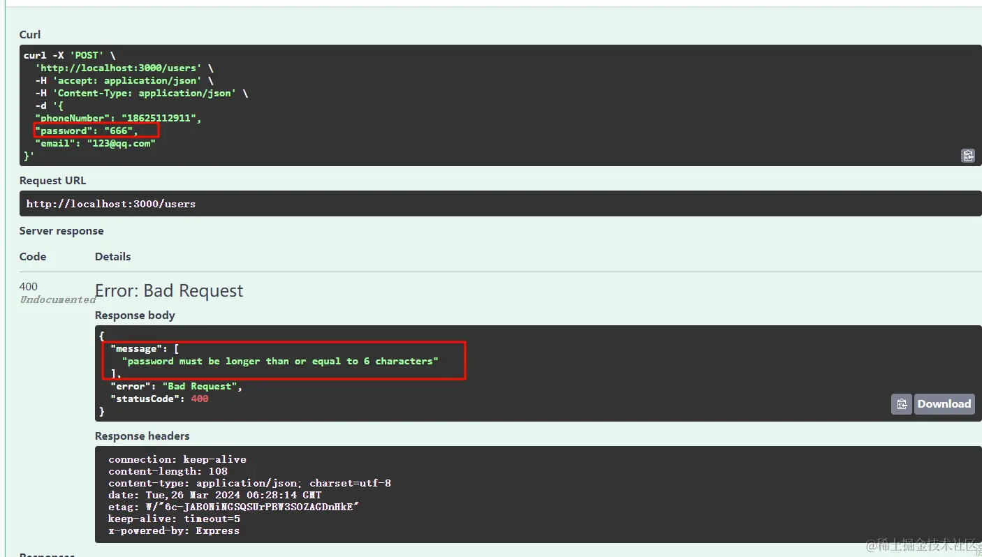 若没有输入正确格式的后端会响应提示,这里设置password长度为6-10,这里输入的不符合就报错了