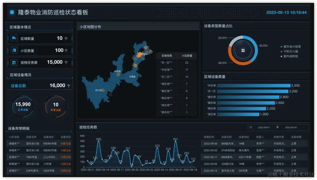 隆泰物业消防巡检状态看板集成了在管园区消防设备和巡检状态的信息,物业管理员可以在该看板中了解到巡检任务的状态、消防设备的统计、异常设备的明细、在管园区的位置和数量的分布等信息;