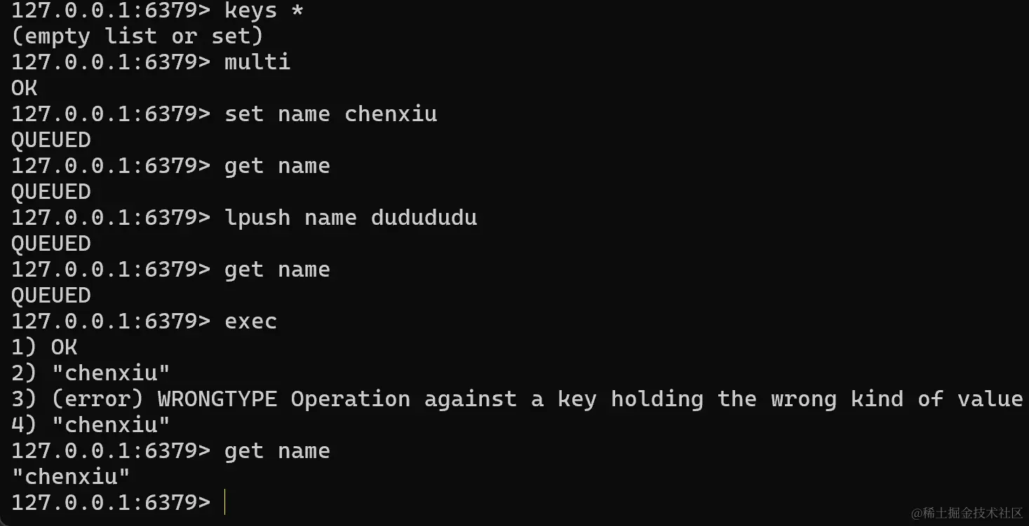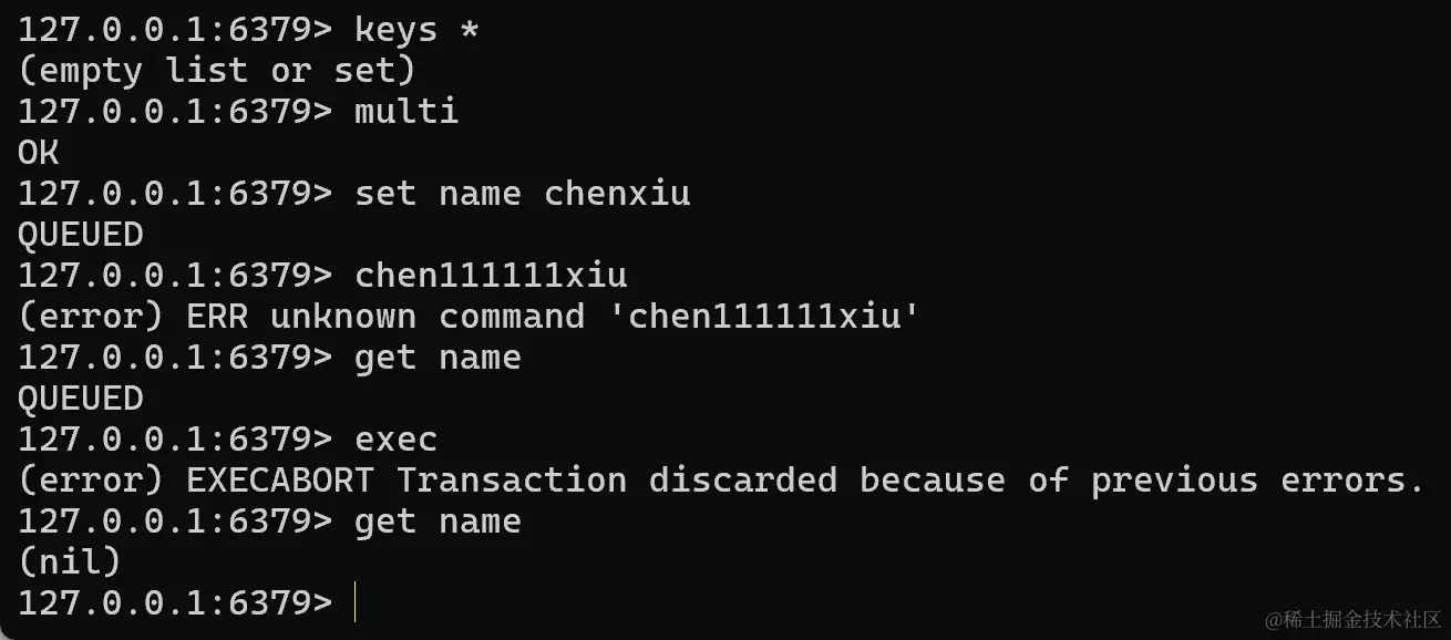 所以当我们每输入一条命令,都会进行一次语法检测,此时我们开始事务,如果出现语法错误即通不过检测,则无法回滚,直接终止事务。返回nil在这里表示键不存在。这里就体现出原子性。