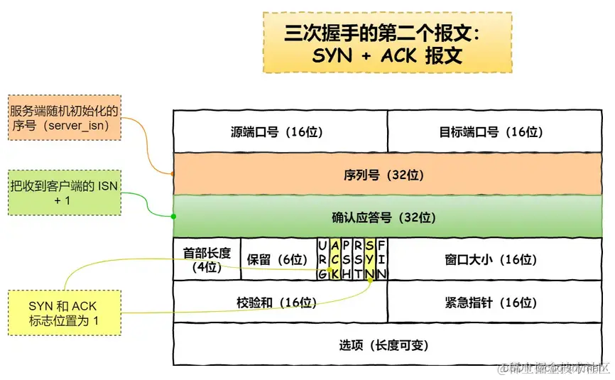 第二次握手:服务器收到客户端的 SYN 报文之后,会以自己的 SYN 报文作为应答,并且服务端也是也随机初始化自己的序号(server_isn),将此序号填入 TCP 首部的「序号」字段中,同时会把客户端的 client_isn + 1 作为 ACK 的值,表示自己已经收到了客户端的 SYN,接着把 SYN 和 ACK 标志位置为 1。最后把该报文发给客户端,该报文也不包含应用层数据,之后服务端处于 SYN_RCVD 状态。