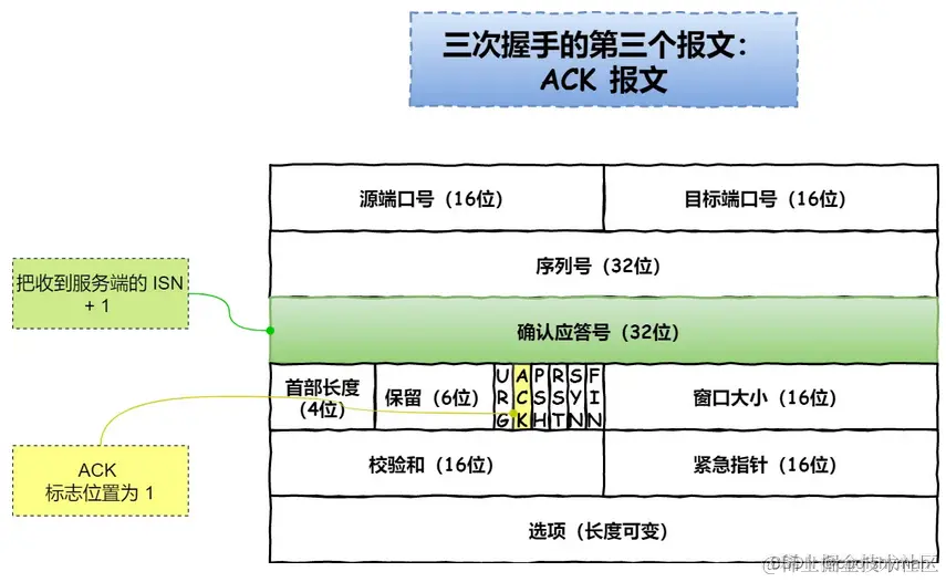 第三次握手:客户端收到服务端 SYN 报文之后,还要向服务端回应最后一个应答 ACK 报文,当然,也是一样把服务器的 server_isn + 1 作为 ACK 的值,把报文发送给服务端,表示已经收到了服务端的 SYN 报文,这次报文可以携带客户到服务端的数据,这时候客户端处于 established 状态。