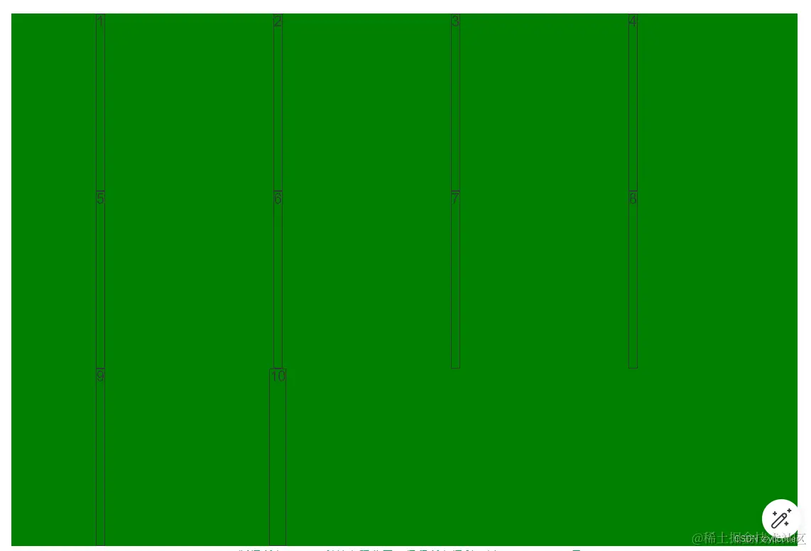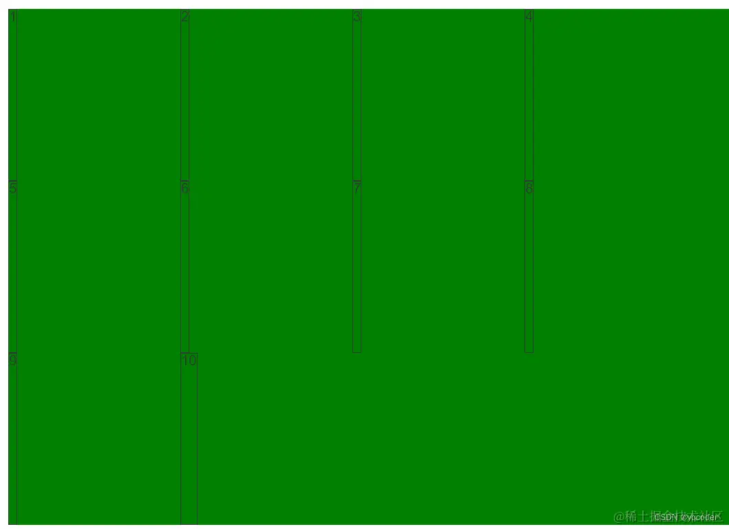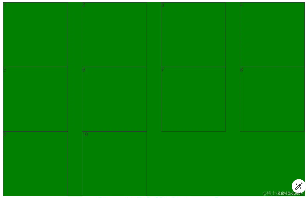 划分容器行和行高,属性同 grid-template-columns 一致,比例 fr 略有不同。如果不设置项目高度,1fr 代表的高度就是项目高度,如果设置有项目设置了高度,那就以该项目的高度除以该项目所分的 fr 算出 1fr 的大小。例:设置列宽 200px,自动铺满列,不设置项目高度,第 1 行 2fr,第 2 行 2fr,第 3 行 3fr。