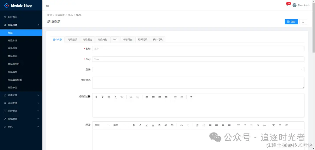 - 商品:分类、品牌、单位、选项(销售属性)、属性、属性模板、属性组。