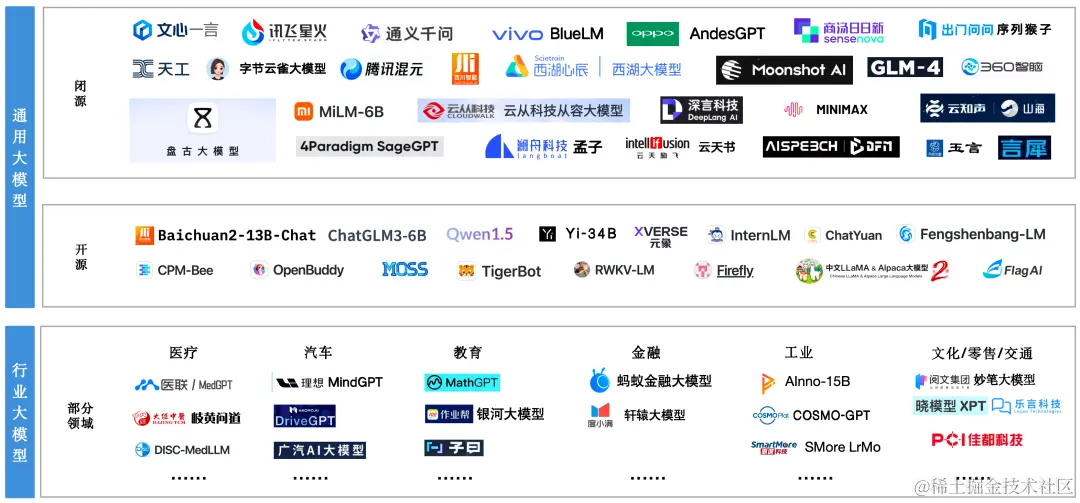 大厂中开源的主导力量是阿里云,在各个参数量级中国都有模型开源。但众多的创业公司是开源模型的主力,如智谱AI、百川智能、零一万物、元象科技、面壁智能。