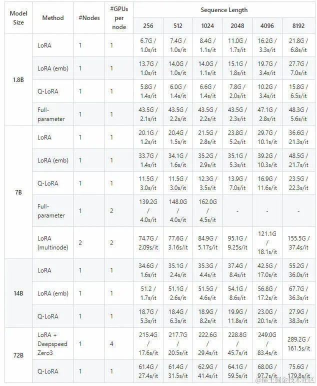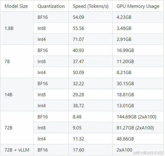 测量了使用BF16、Int8和Int4中的模型生成序列长度(Sequence Length)2048的平均推理速度和GPU内存使用情况。