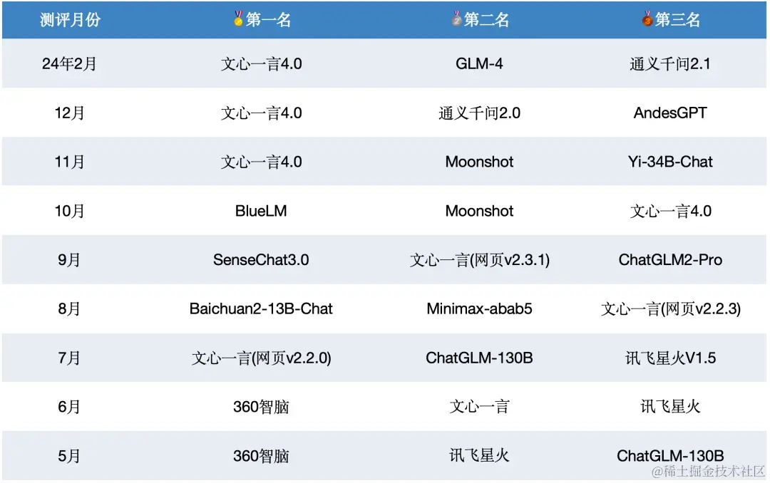 SuperCLUE月榜首位的大模型有5个。分别是文心一言、BlueLM、SenseChat3.0、Baichuan2-13B-Chat、360智脑。其中,百度的文心一言登顶SuperCLUE月榜的次数最多,分别在7月、11月、12月、24年2月取得了SuperCLUE最好成绩。