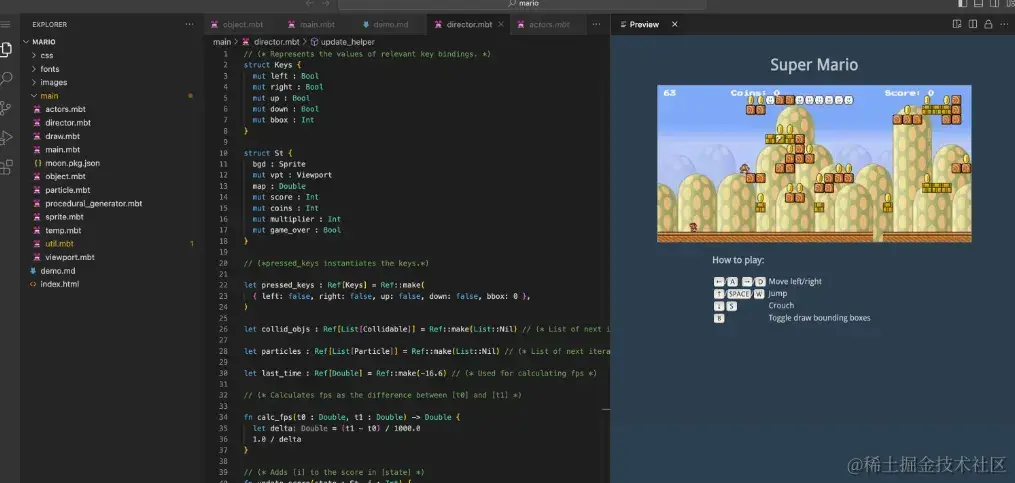 在现场演示中,张宏波通过更改马里奥游戏代码逻辑,向大家展示了 MoonBit 实时 IDE 的编程效果。