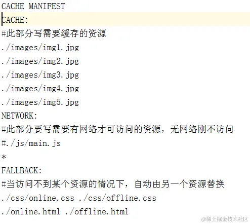 (4)FALLBACK: 换行 当被缓存的文件找不到时的备用资源(当访问不到某个资源时,自动由另外一个资源替换)。
