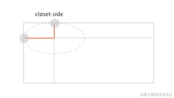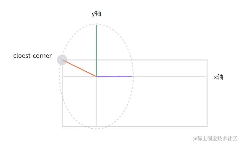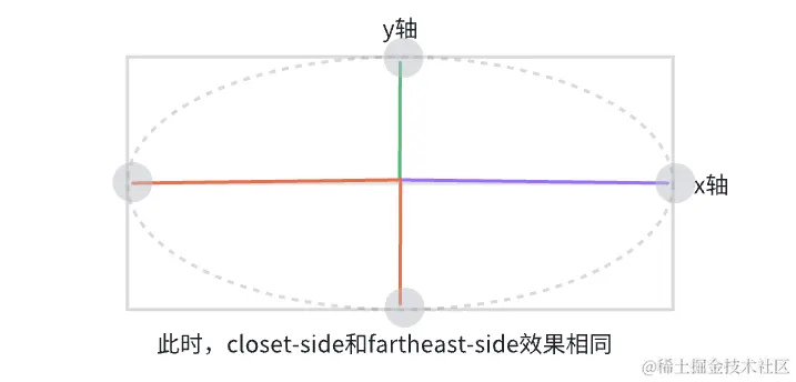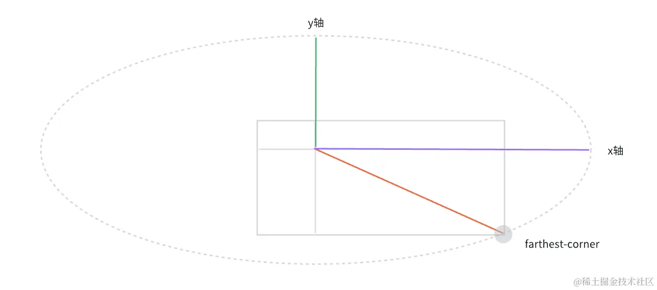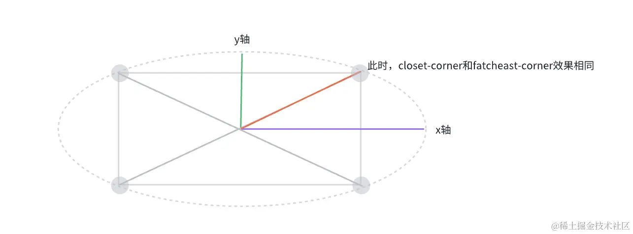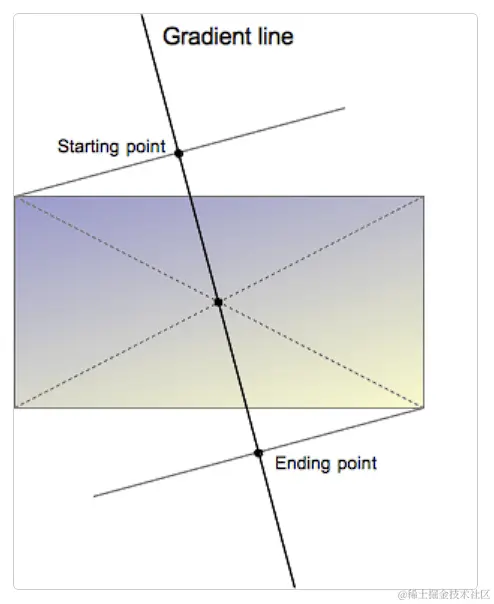 起点是渐变线上代表起始颜色值的点。终点是渐变线上代表最终颜色值的点。这两个点都是由渐变线和从最近的顶点发出的垂直线之间的交叉点定义的,然而从起点的对称点来定义终点是更容易理解的一种方式,因为终点是起点关于容器的中心点的对称点。这一复杂的定义导致了一个有趣的效果,有时称为 magic corners:起点附近的点具有跟起点相同的颜色值,终点附近的点具有跟终点相同的颜色值。