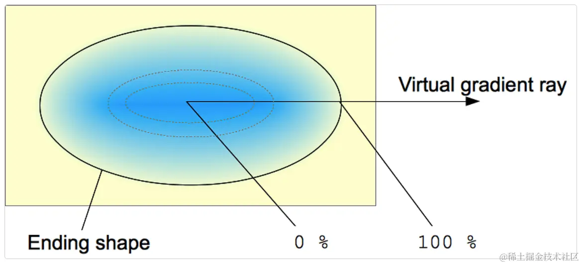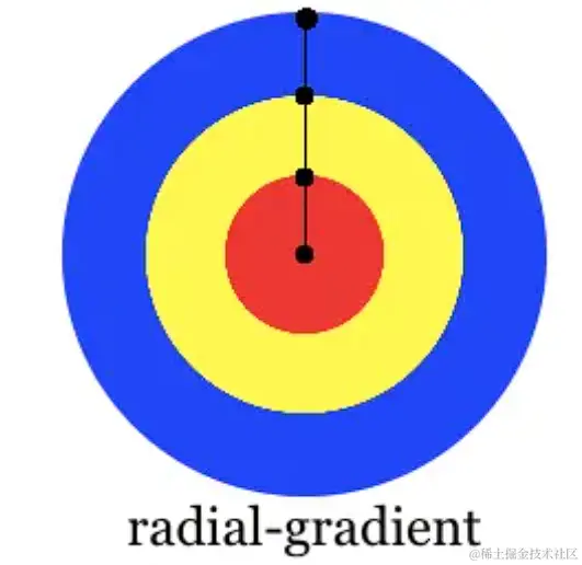 渐变线由包含渐变图形的容器的中心点和一个角度来定义的。渐变线上的颜色值是由不同的点来定义,包括起始点、终点,以及两者之间的可选的中间点(中间点可以有多个)。