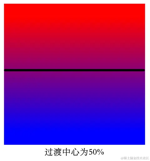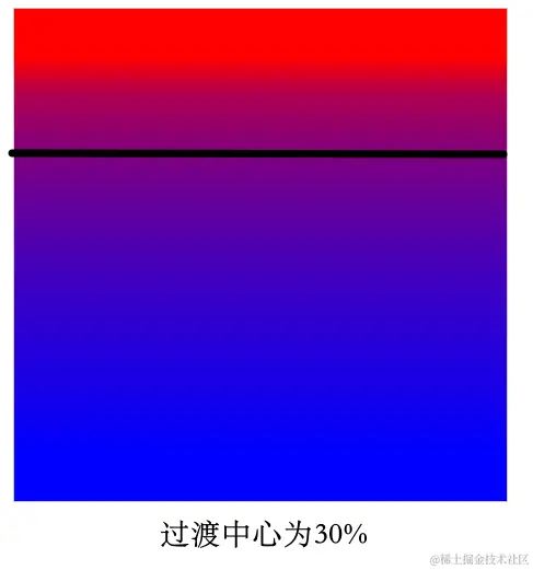 上面这个例子中,起始点到 10% 是纯红色,90% 到结束点是纯蓝色。10% 和 90% 之间是颜色从红色过渡到蓝色的地方,设置颜色过渡的中点在 30% 的位置,假如没有设置,过渡中点就会是 50% 的位置。