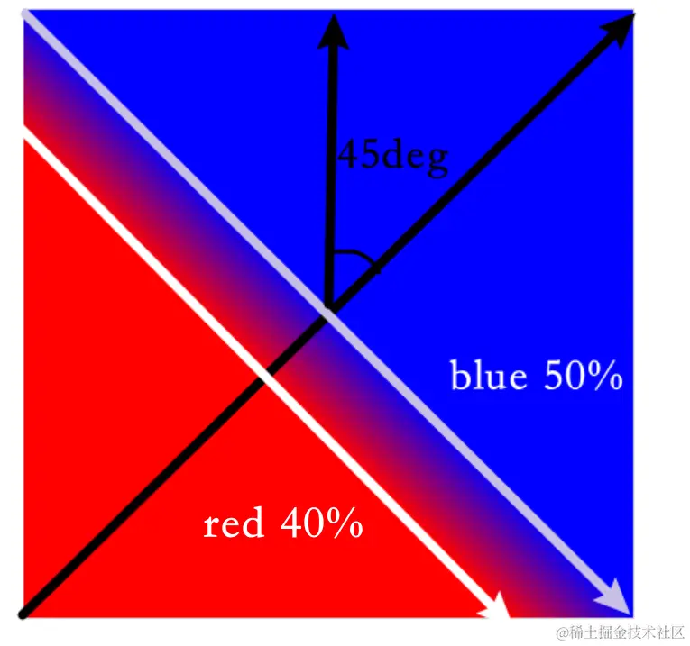linear-gradient(45deg, red 0px 40%, blue 50% 100%);