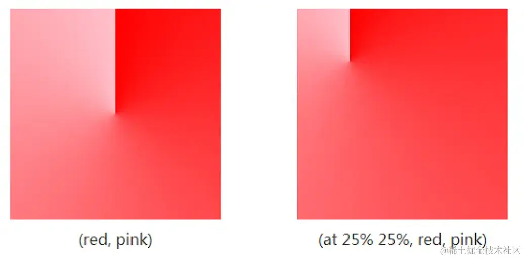 可以在每个颜色后设置颜色的起始位置,位置根据渐变类型的不同,有不同的取值。线性渐变取值为百分比或具体的长度,径向渐变取值为百分比或具体的长度,锥形渐变只能取值百分比或度数,绝对长度无效。