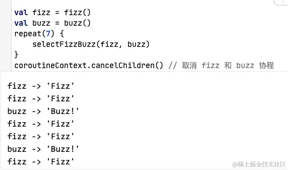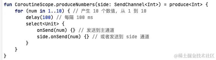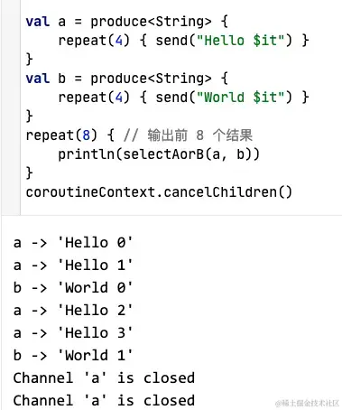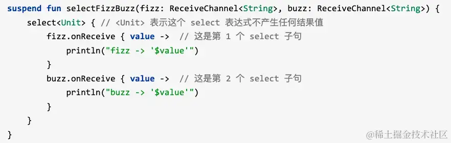 - select选择:上面通道中介绍了多个挂起函数发送值的场景,使用select选择语法可以在多个挂起函数中选择第一个执行完毕的结果,其他挂起函数取消或者关闭。