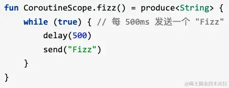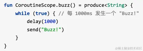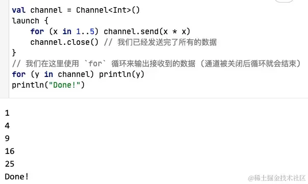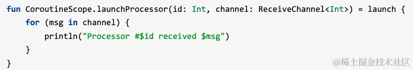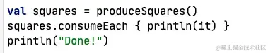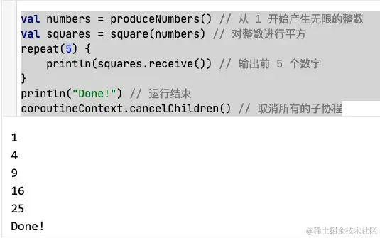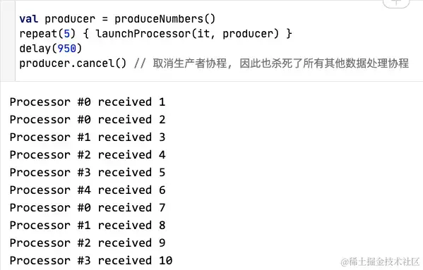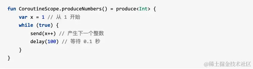有一个便利的协程构建器, 名为 produce, 它可以很简单地编写出生产者端的正确代码, 还有一个扩展函数 consumeEach, 可以在消费者端代码中替代for循环:即:-