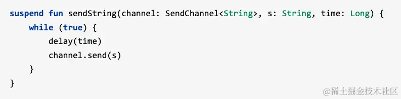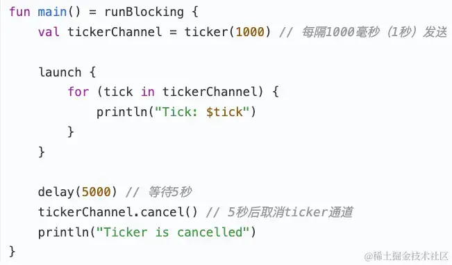 定时器通道:类似于timer定时任务,即根据指定的定时时间发送一个unit的定时值,用户可以根据定时值处理一些常见的定时逻辑,可以使用 ticker 工厂函数来创建这种通道. 使用通道的 ReceiveChannel.cancel 方法来指出不再需要它继续产生数据了。即: