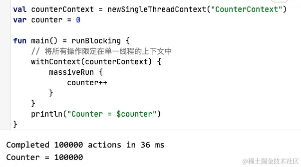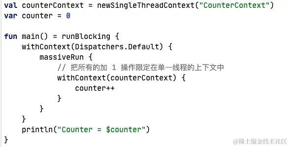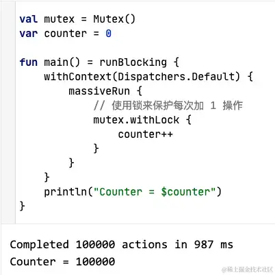 * 还有一个扩展函数 withLock, 它用非常便利的方式实现mutex.lock(); try { ... } finally { mutex.unlock() }模式: